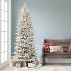 7.5′ Pre-lit Flocked Halifax Fir Artificial Slim Christmas Tree, Color Select LED Lights