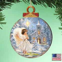 Ornaments depict a wreath with nativity scenes, flowers, and animals around it